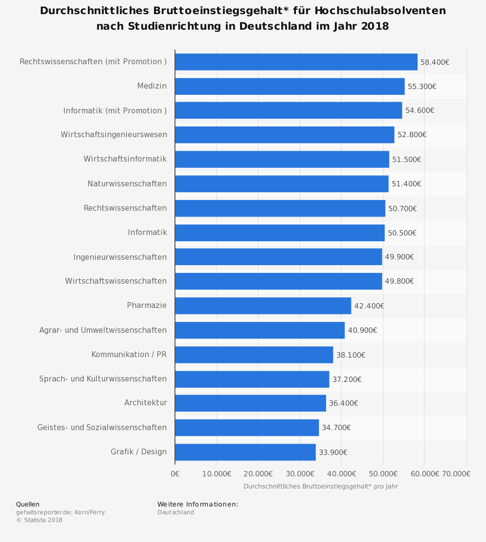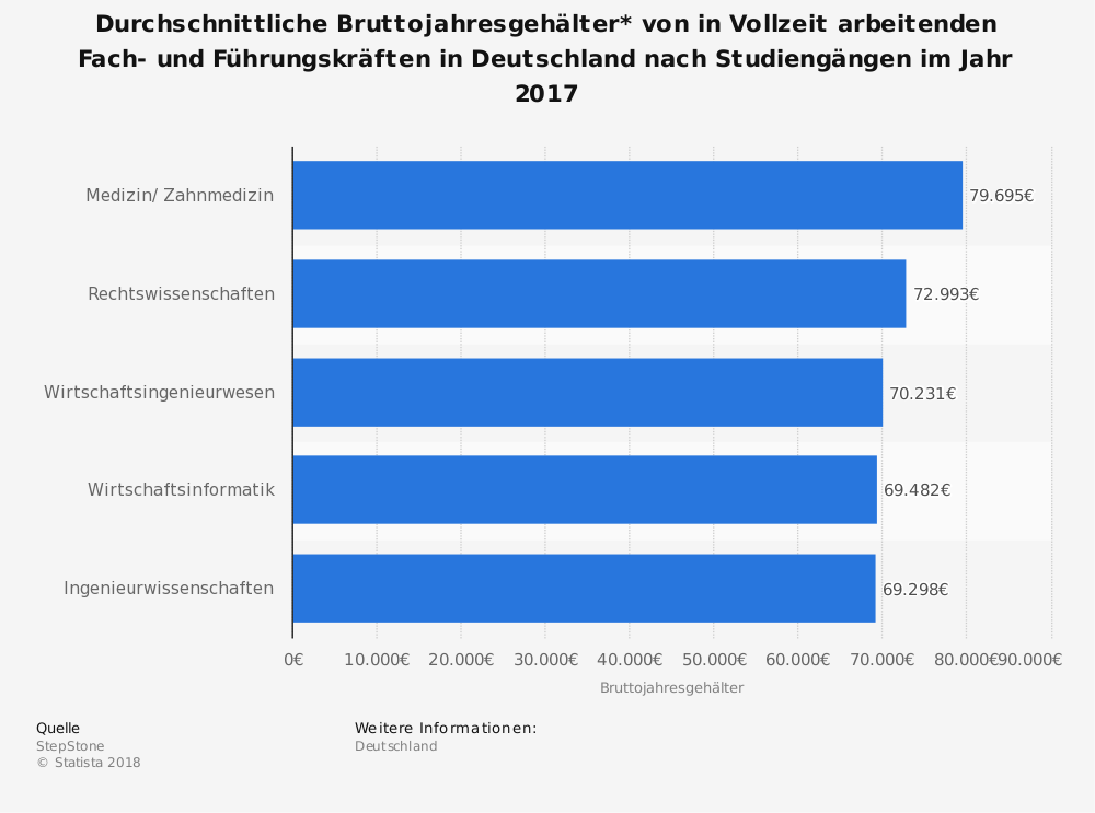 Der Stepstone Gehaltsreport 2018 beziffert das durchschnittliche Jahresgehalt von Wirtschaftsingenieurwesen-Absolventen auf rund 70.231 Euro! Die Top-Gehaltszahl verdeutlicht: Das Einstiegsgehalt steigt enorm an. Grafisch dargestellt und in Vergleich zu anderen Studienfächern gesetzt, sah das Ganze in 2017 dann so aus: