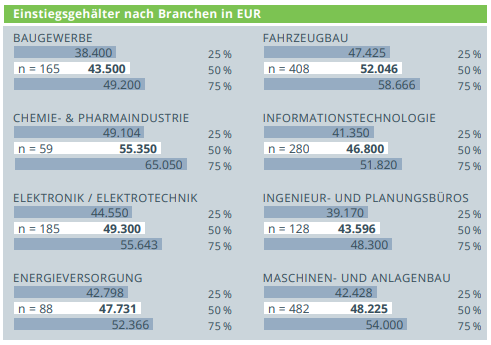 Viel entscheidender ist die Branche. Auch bei den Berufseinsteigern liegen jene in Chemie- und Pharmaindustrie vorne, aber auch in der Elektrotechnik, im Maschinenbau und der Energieversorgung können sich die Einstiegsgehälter sehen lassen: