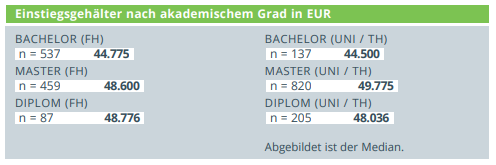 Eine Gehaltsumfrage unter 2.306 Berufseinsteigern des VDI hat ergeben, dass diese jährlich zwischen gut 45.000 - 48.000 Euro verdienen. Dabei ist auch deutlich geworden, dass die Bildungseinrichtung, an der das Studium absolviert wurde, also ob Uni oder FH, kaum einen Unterschied macht:
