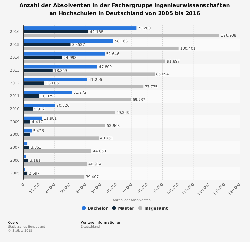 Nicht nur immer mehr Schulabgänger entscheiden sich für ein Studium, viele von ihnen lassen sich für die Technik begeistern. So ist die Anzahl der Absolventen in den letzten zehn Jahren um ein Vielfaches gestiegen. Während 2005 gerade einmal knapp 40.000 Studierende einen Abschluss im Ingenieurwesen machten, waren es 2016 fast 127.000.