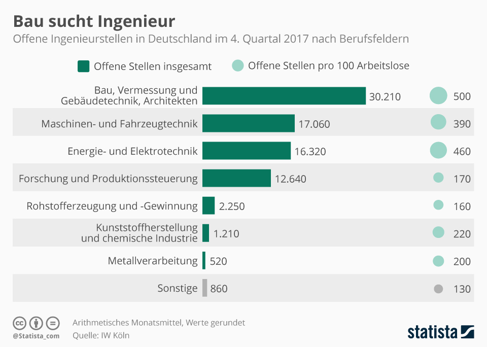 Vor einigen Jahren waren sich alle einig: Deutschland leidet an einem Ingenieurmangel. Heute haben sich die Aussagen darüber relativiert. Doch Ingenieure werden immer noch dringend gesucht: Im letzten Quartal von 2017 waren über 80.000 Ingenieur-Stellen in Deutschland frei, aber es gab nur 24.000 Ingenieure, die einen Job gesucht haben. In welchen Bereichen der Arbeitsmarkt besonders nach Fachkräften sucht, zeigt die folgende Grafik: